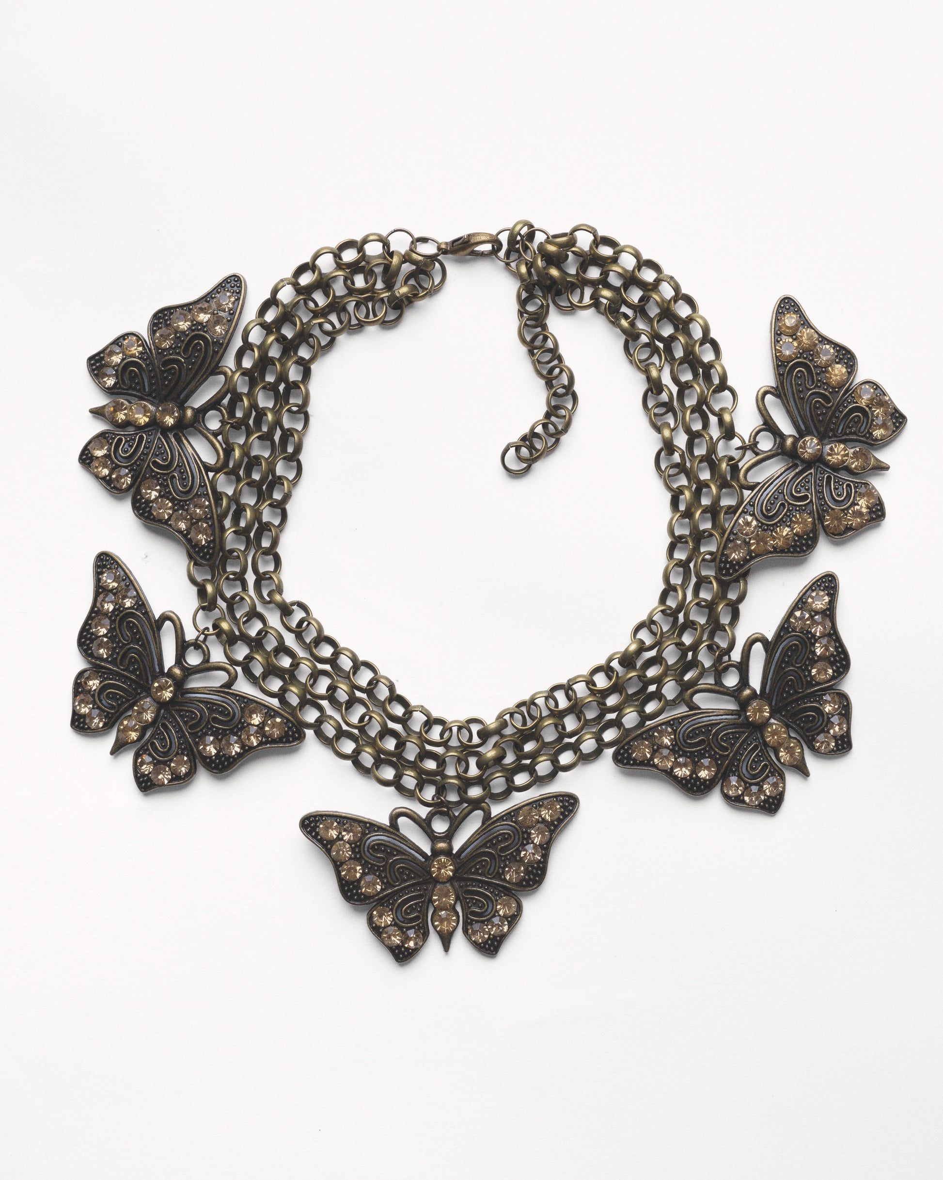 Three layers of steel chains adorned with butterfly pendants set with zirconias.