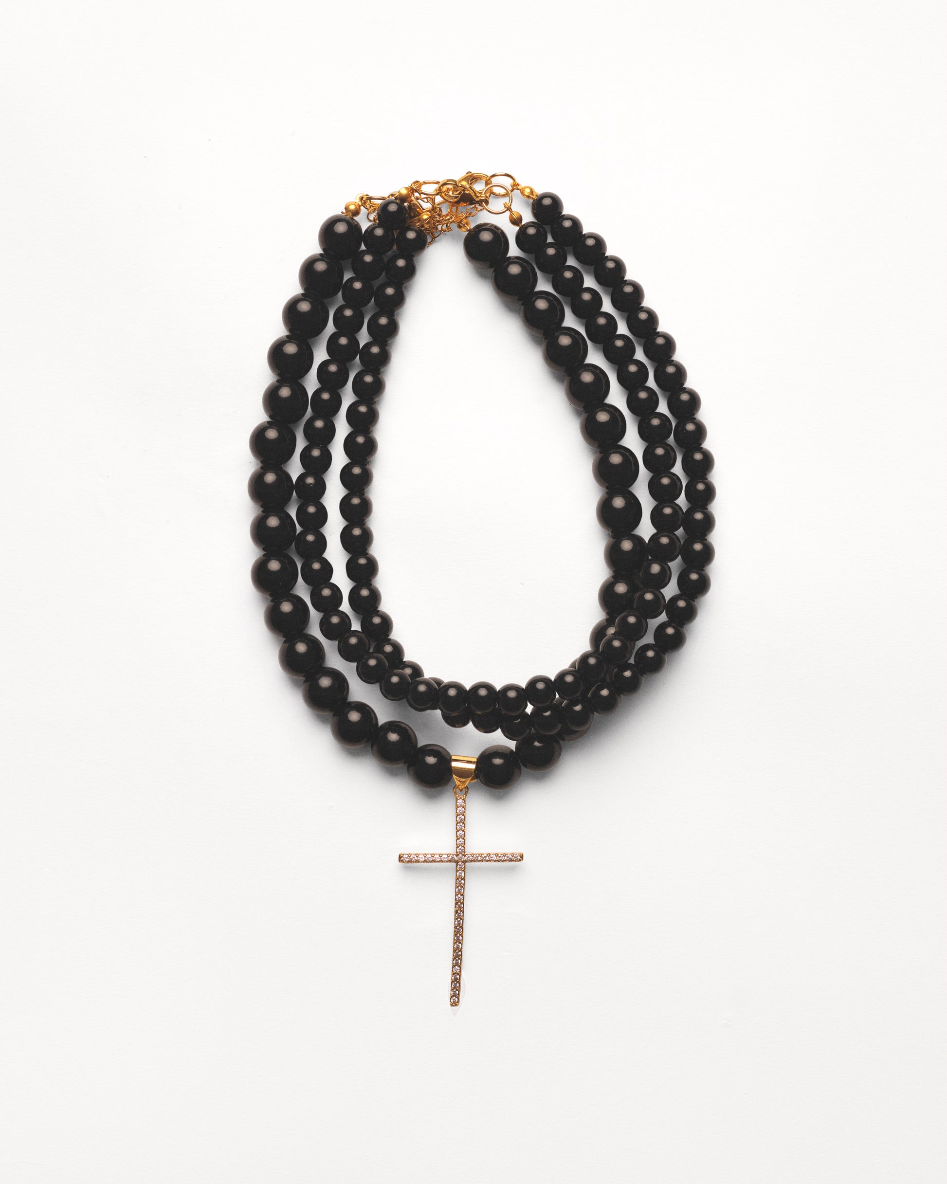Layered black choker with acrylic beads and zirconia cross pendant.