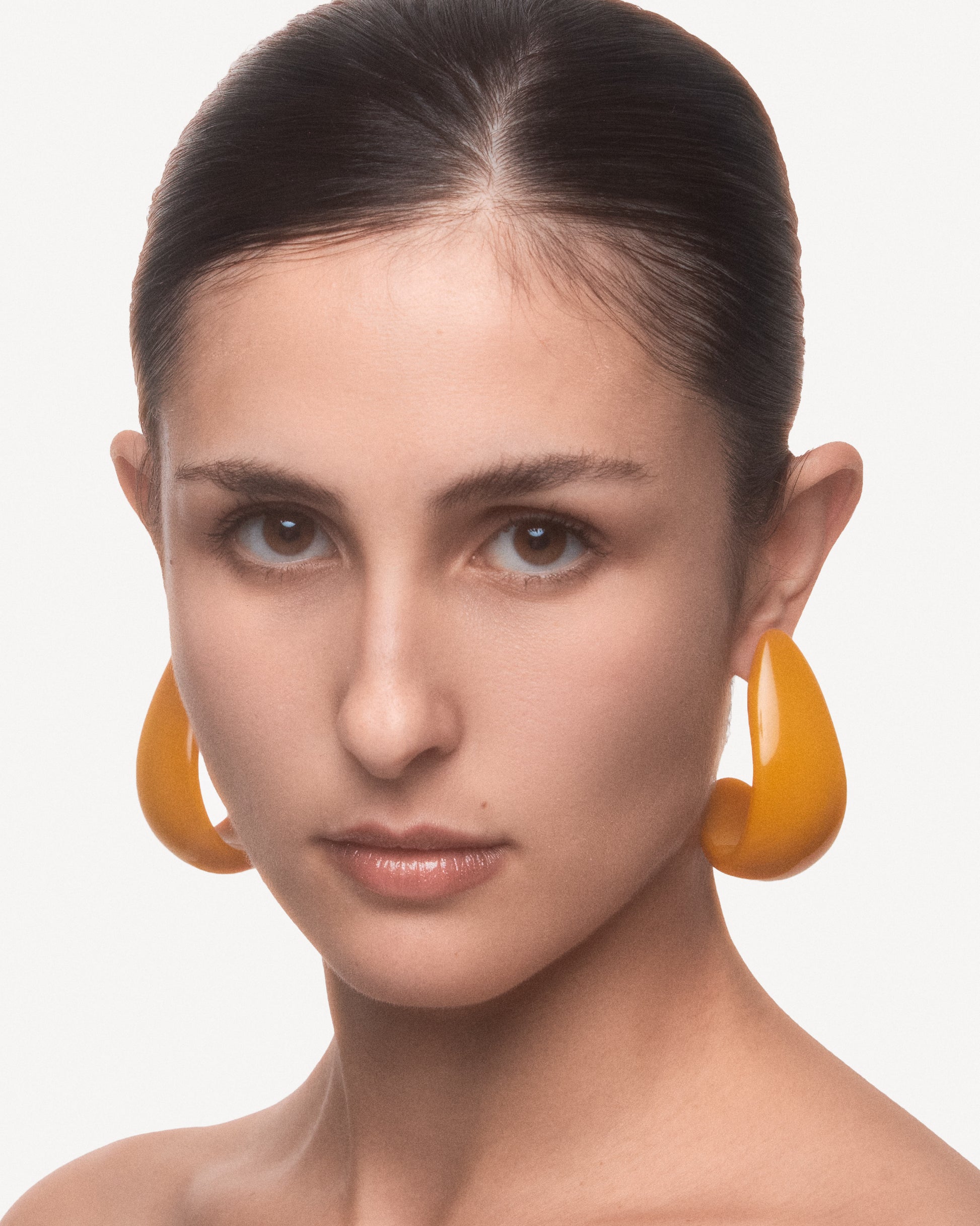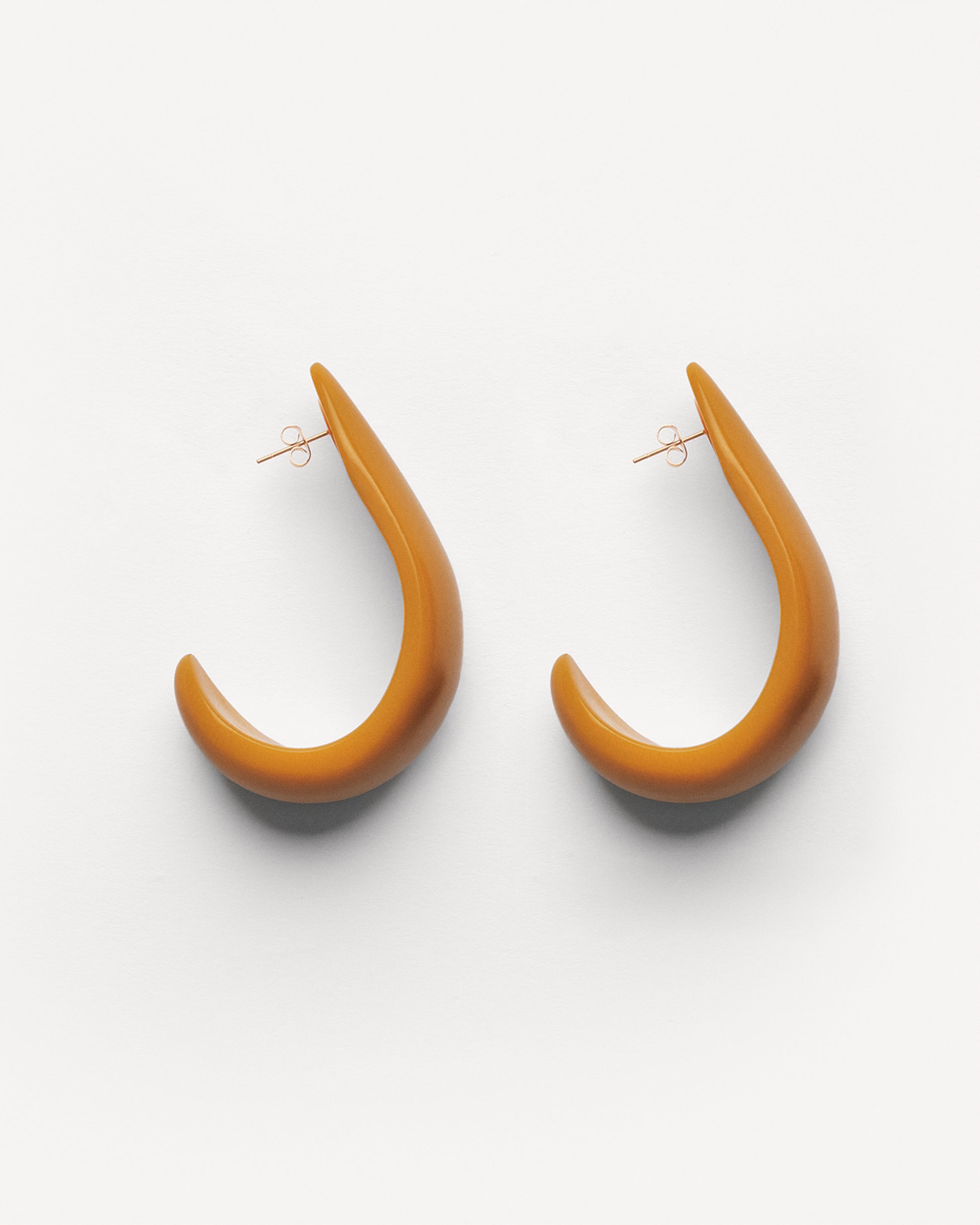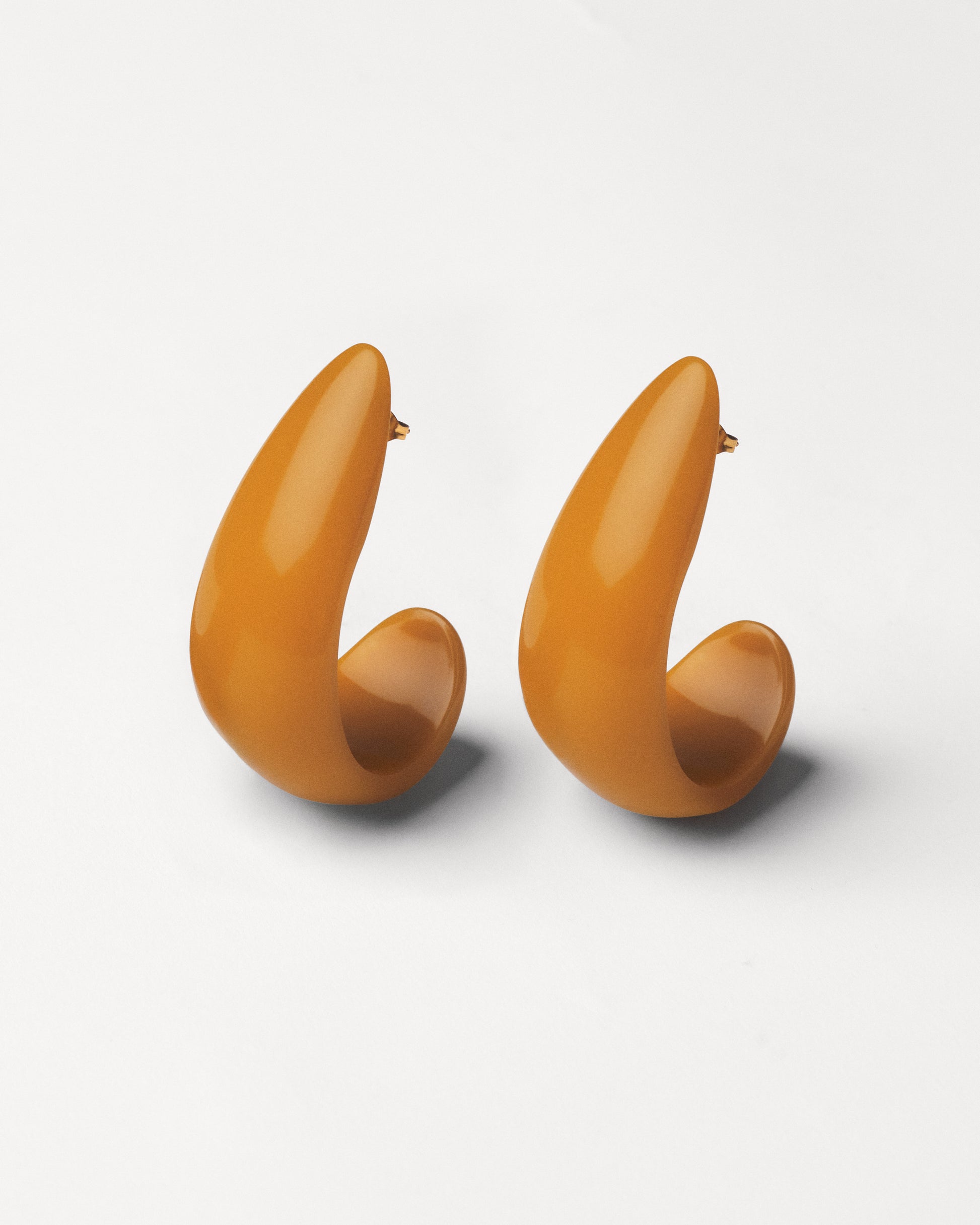 These resin earrings are entirely handcrafted, shaped one by one to achieve their organic, curved silhouette. Finished with stainless steel ear posts for comfort and durability.