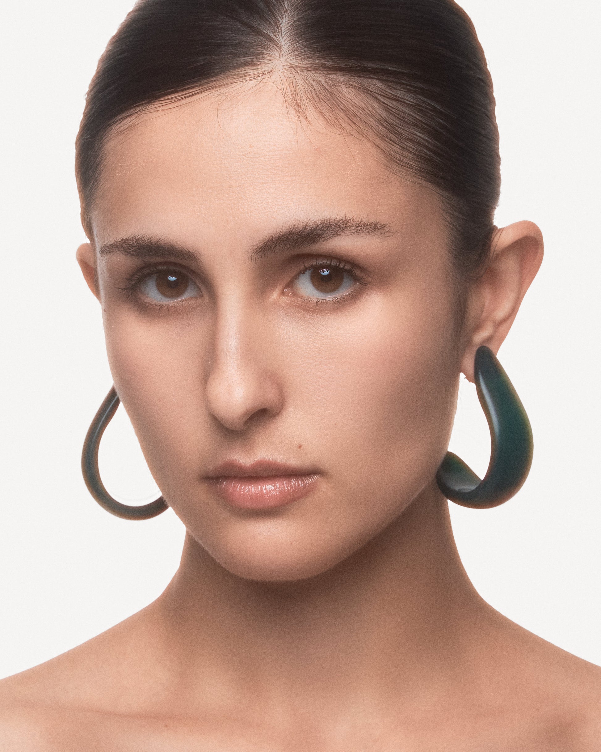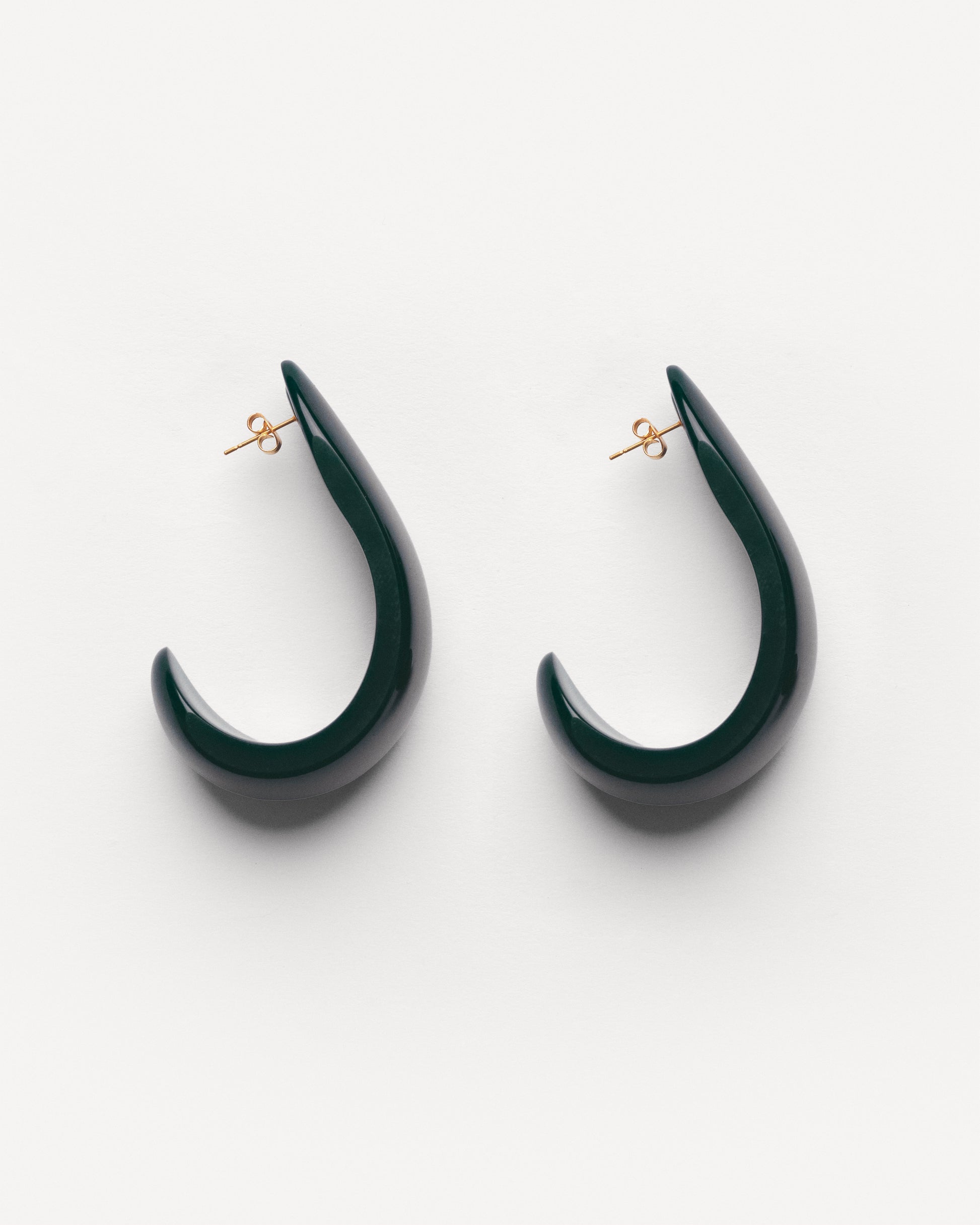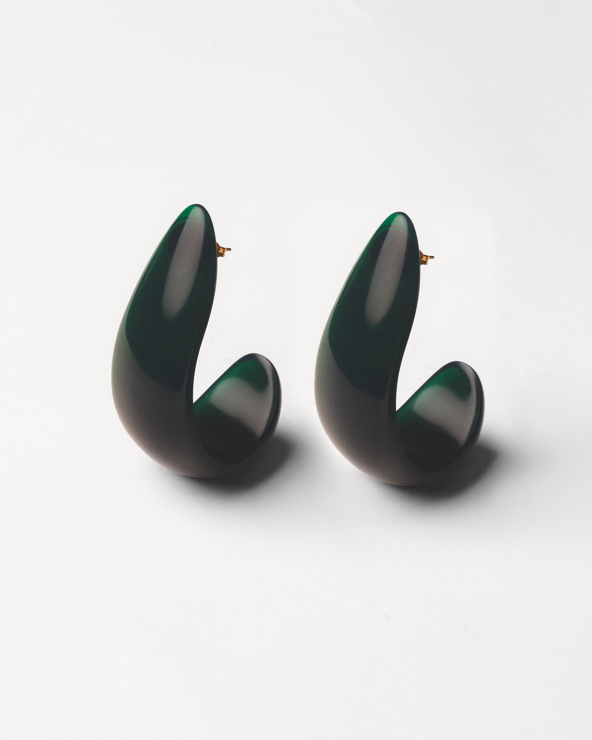 These resin earrings are entirely handcrafted, shaped one by one to achieve their organic, curved silhouette. Finished with stainless steel ear posts for comfort and durability.