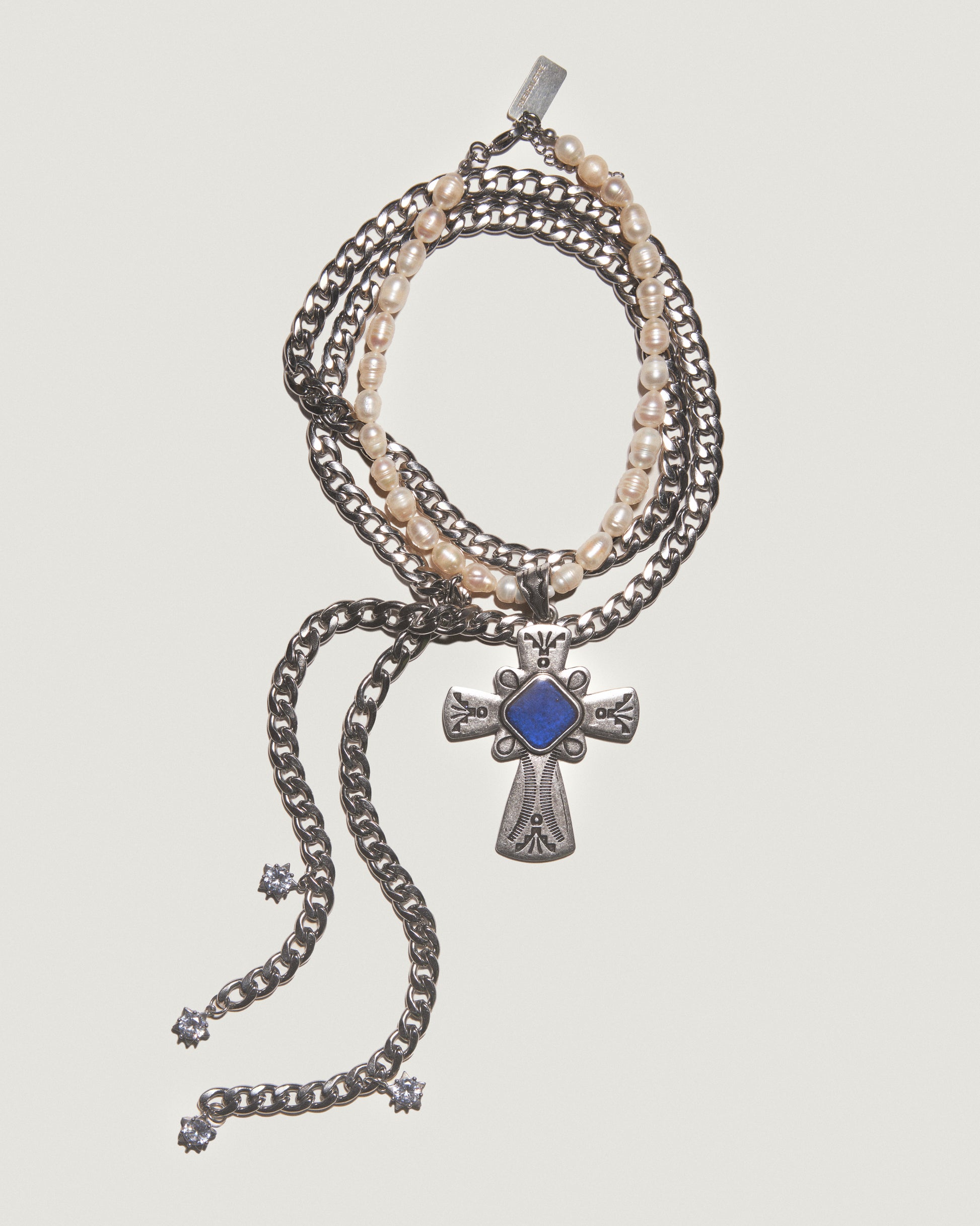 Set of two necklaces that can be worn separately: one features oval-shaped cultured freshwater pearls with a large zamak cross pendant in blue enamel, while the other is a long stainless steel chain with pendants at the ends. The chain can be styled in multiple ways. Finished with stainless steel clasps and a 925 sterling silver brand tag.