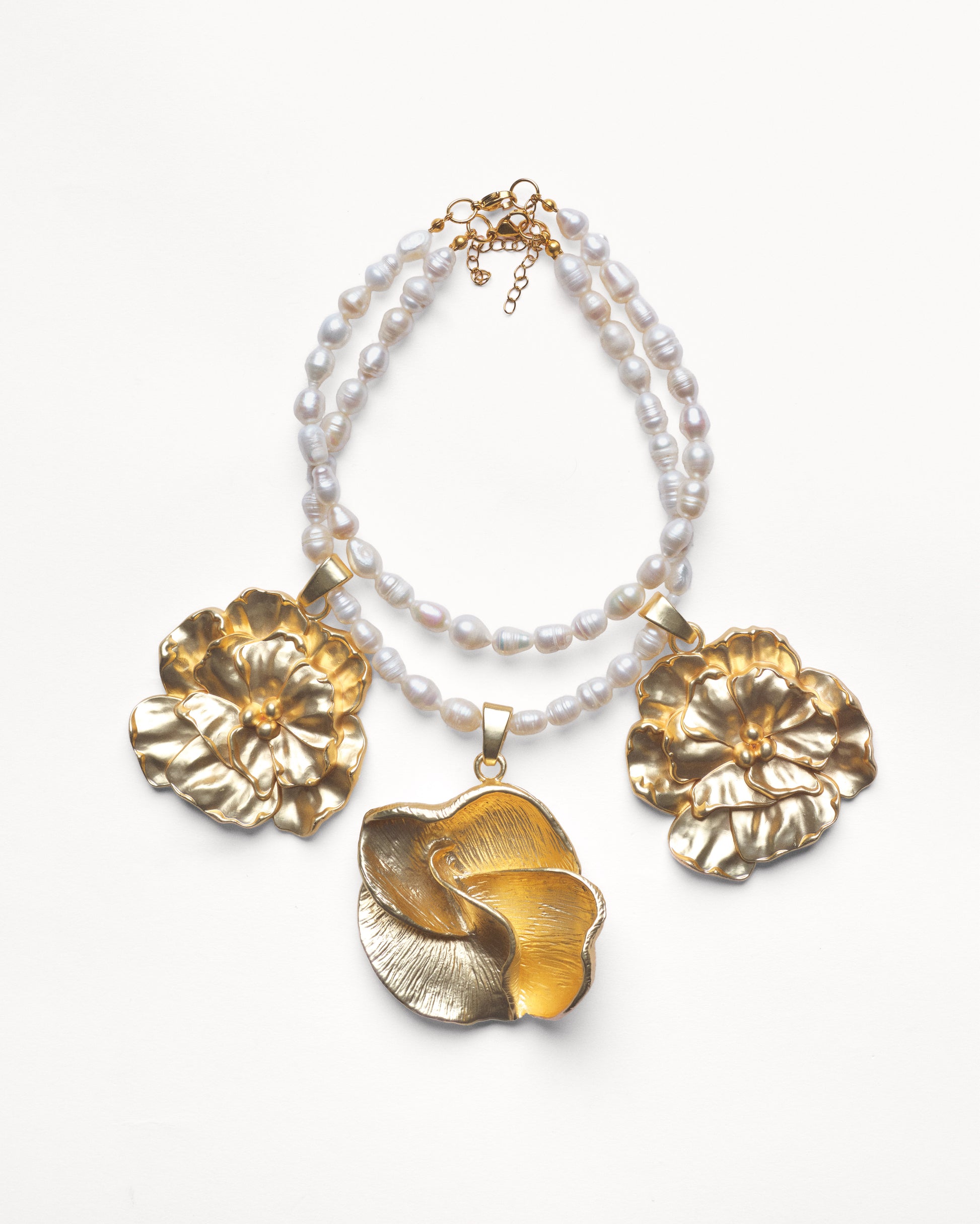Two rows of aquaculture pearls framing sculptural gold zamak flowers.