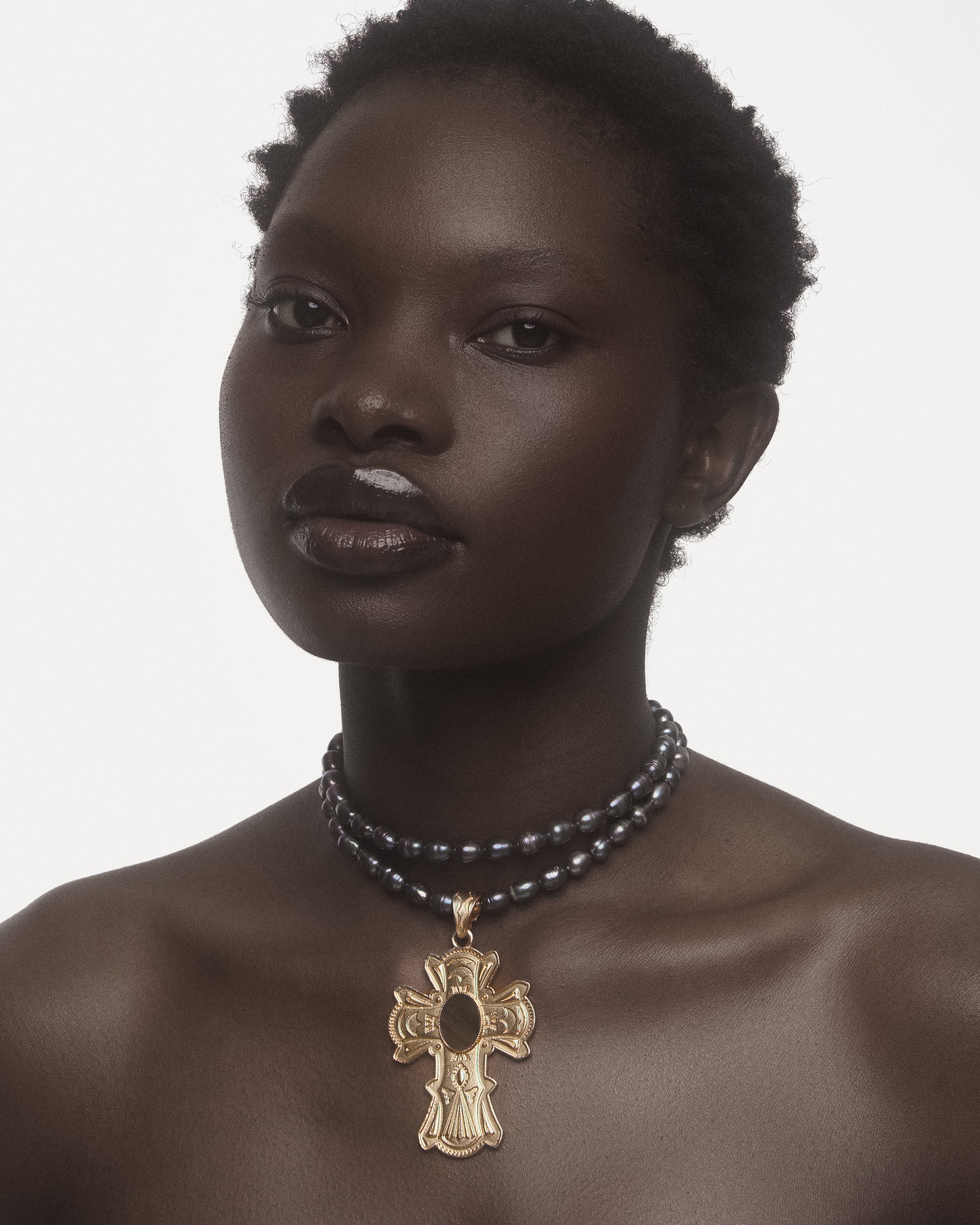 Crafted with aquaculture pearls, stainless steel, and a cross pendant in zamak, adorned with mother-of-pearl.